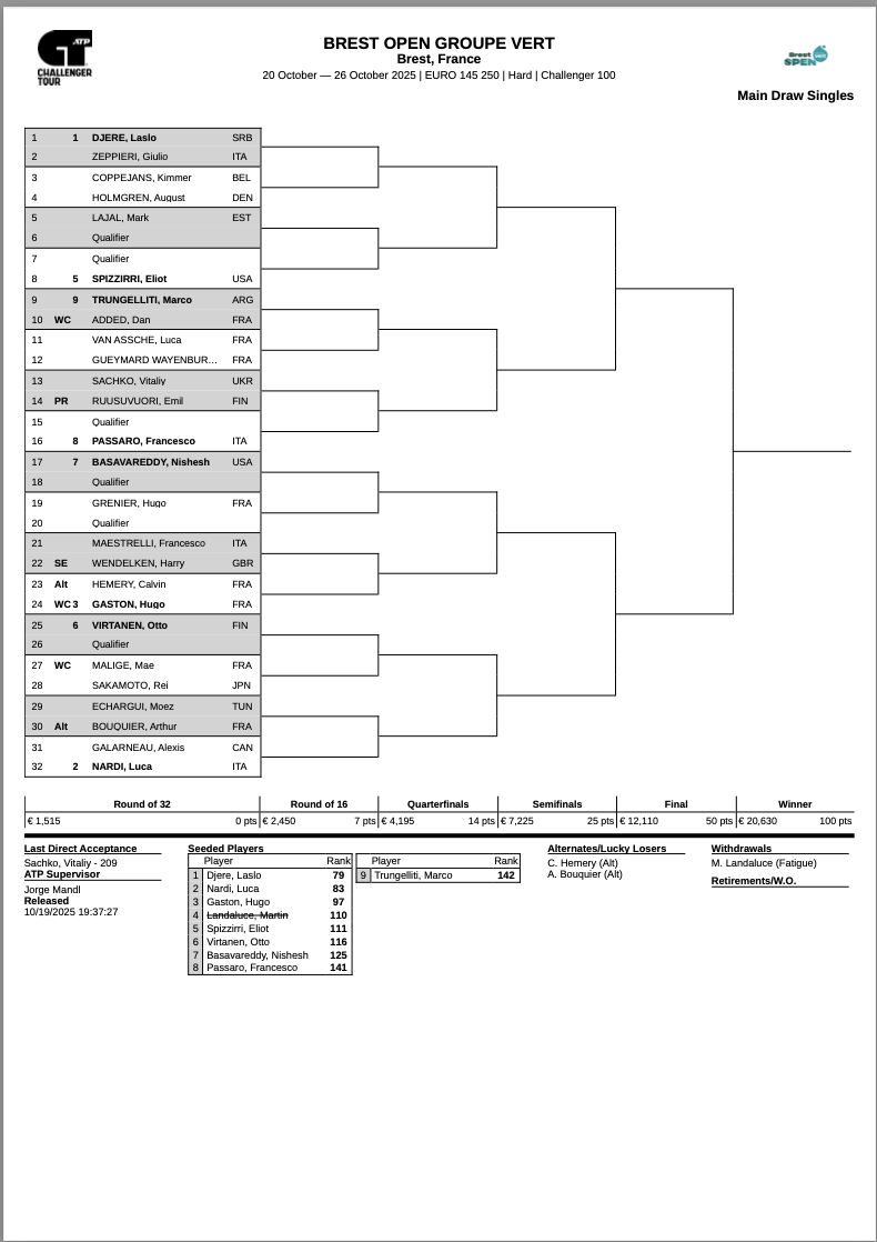 Un choc GASTON - HEMERY au premier tour, des qualifications inattendues, le tableau final du Brest Open Groupe Vert