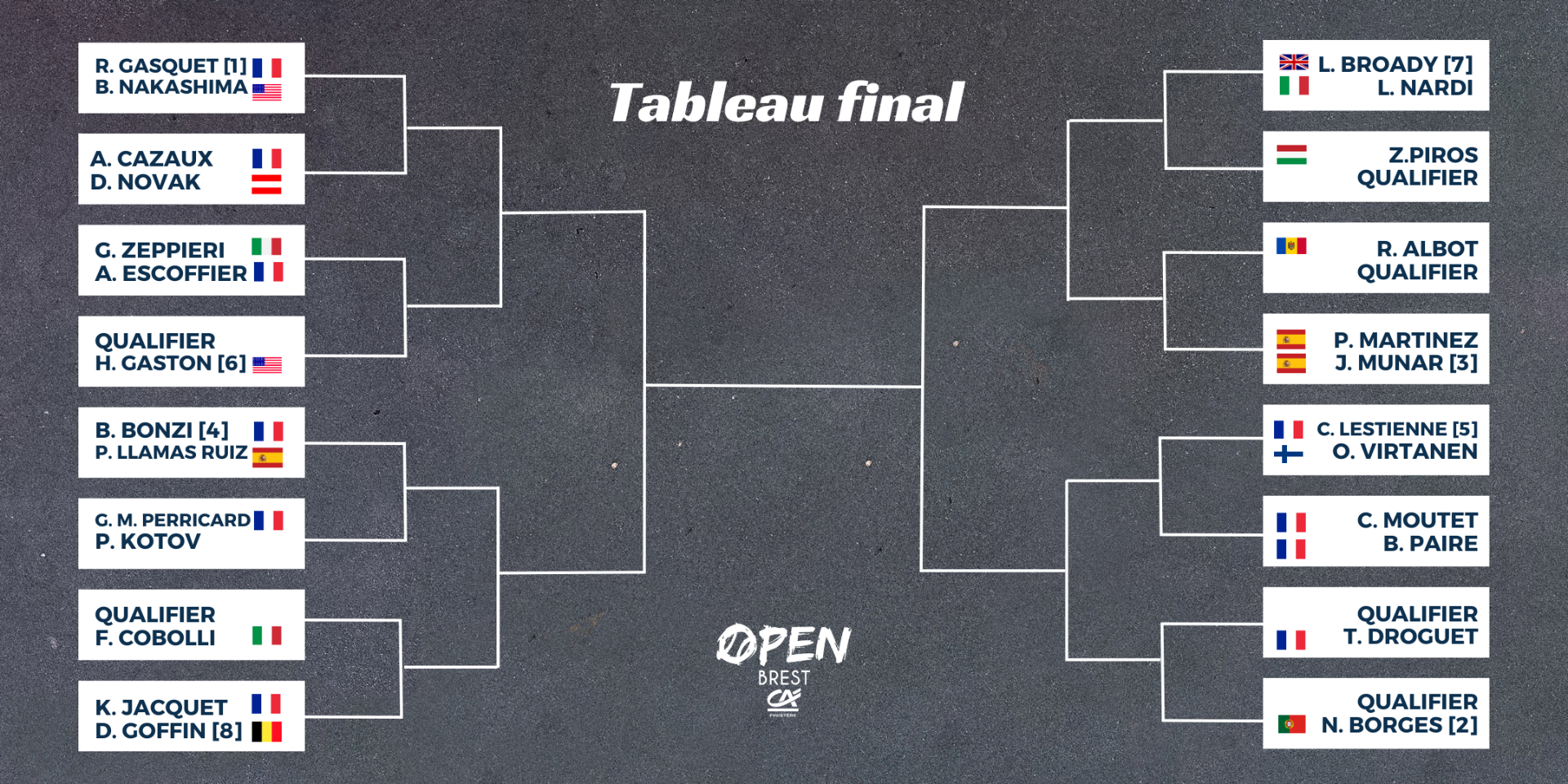 Le tableau final de la 8ème édition de l’Open Brest Crédit Agricole est connu. Du jamais vu avec deux rencontres chocs dès le 1er tour !